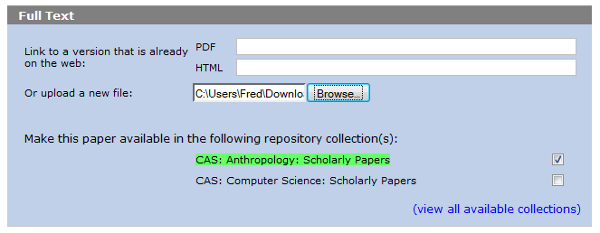 Each user can choose which collections they want to use from the list of all available in the repository, using the '(view all available collections)' link shown in the full text area of the reference editing page. A default collection can also be set which will be selected for all new uploads: